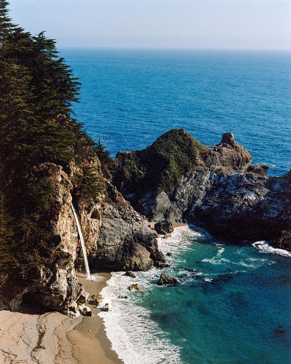 This photo was taken at McWay Falls in Big Sur in May 2024. It was captured on 35mm film and displays typical film characteristics like visible grain and a softer focus compared to modern digital photography. Your print will be created from a scan of the original negative. Shot on an Olympus OM-1n on Kodak Portra 400.