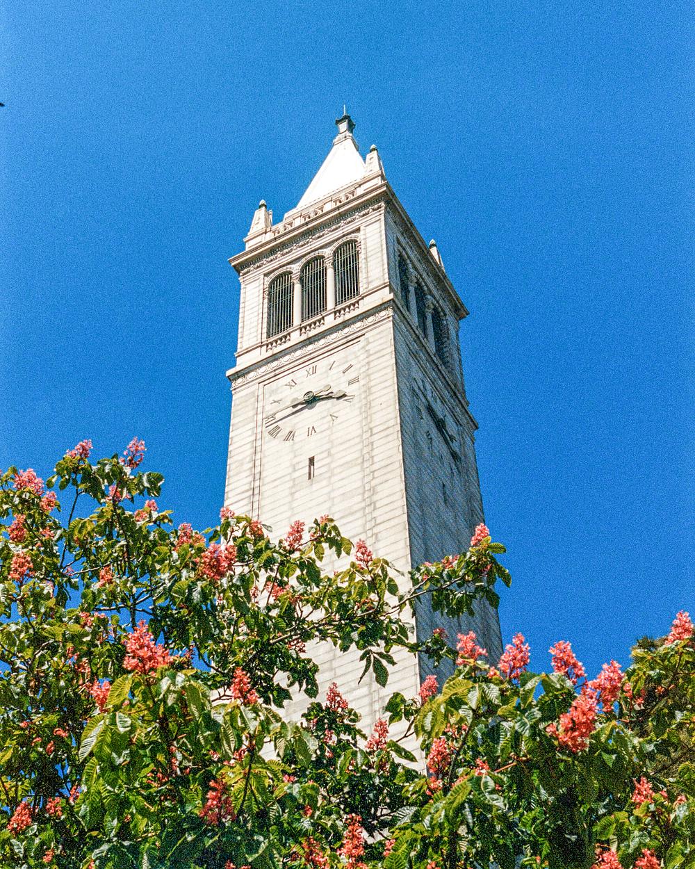 This photo was taken at The Campanile at UC Berkeley in May 2024. It was captured on 35mm film and displays typical film characteristics like visible grain and a softer focus compared to modern digital photography. Your print will be created from a scan of the original negative. Shot on an Olympus OM-1n on Kodak Portra 400.