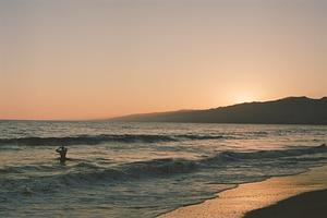 This photo was taken at sunset in Santa Monica in August 2024. It was captured on 35mm film and displays typical film characteristics like visible grain, a softer focus compared to modern digital photography, and occasional lens artifacts. Your print will be created from a scan of the original negative. Shot on an Olympus OM-1n on Kodak Portra 400.